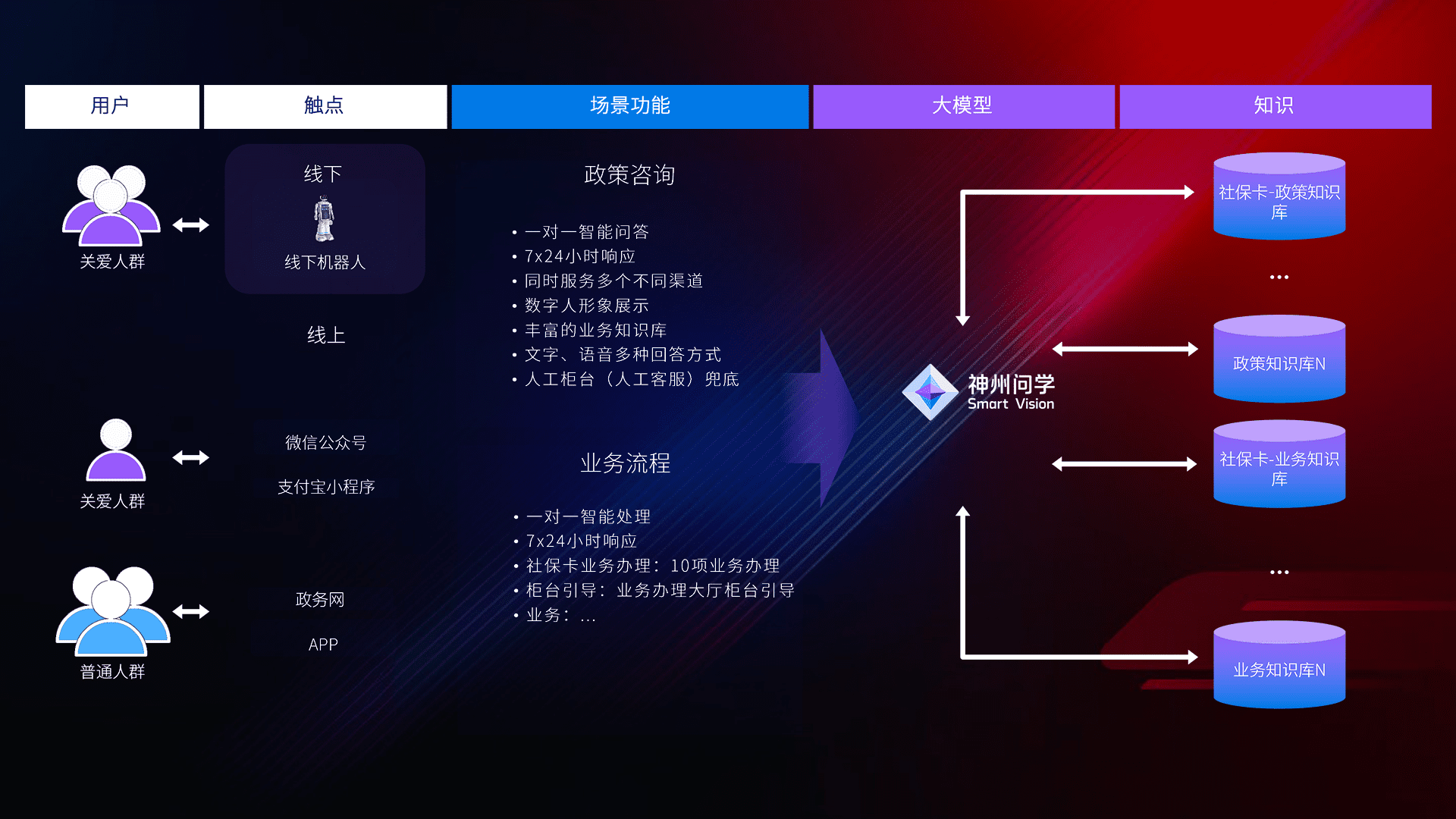 • 线上线下全覆盖:线上提供微信公众号、、、、支付宝小程序、、、、政务网、、、、app多种渠道,,,与线下机器人形成完整服务体系。。